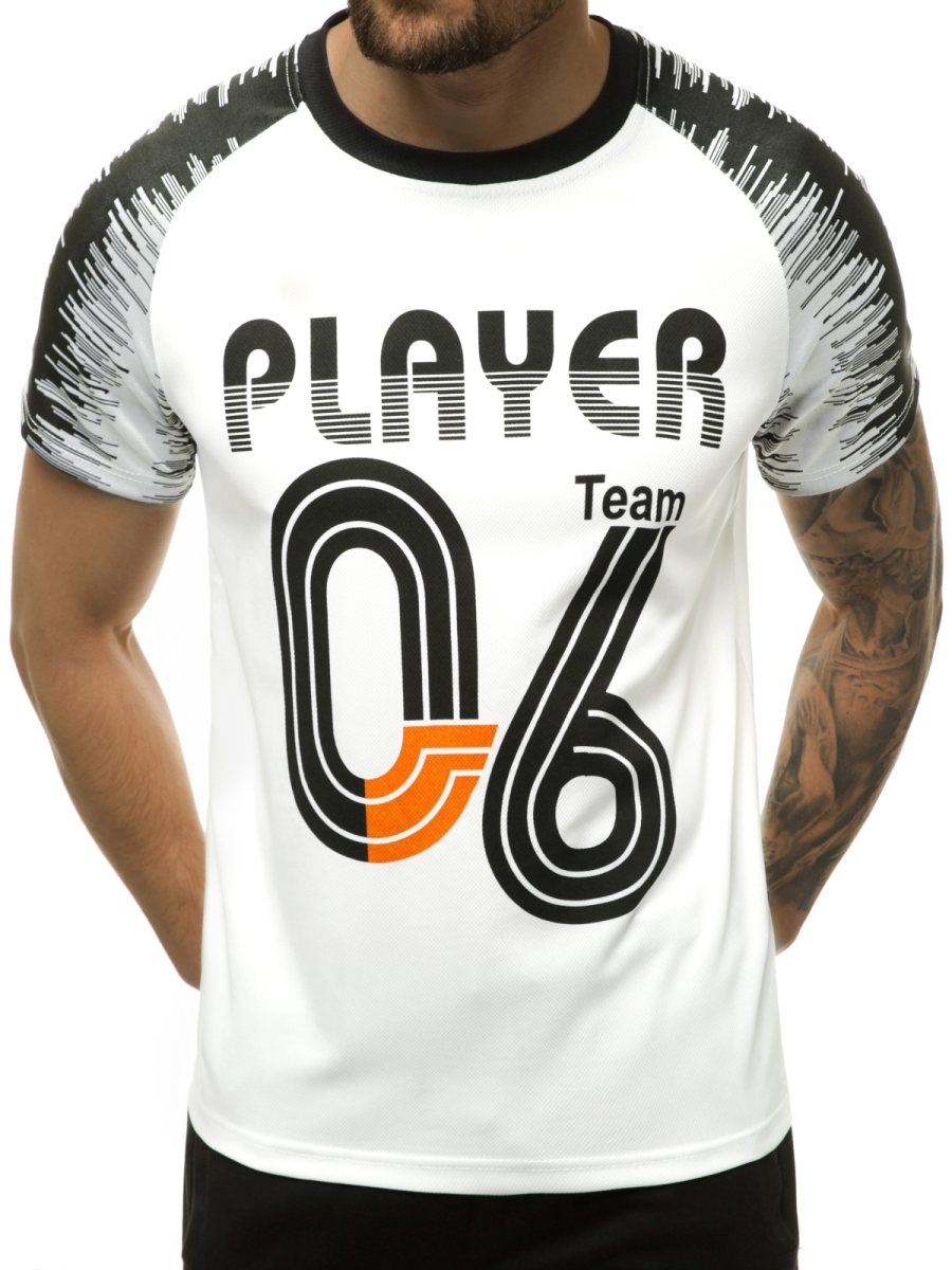 - Pánské tričko má: Potisk vpředu a na rukávech, Kulatý výstřih do U pod krkem