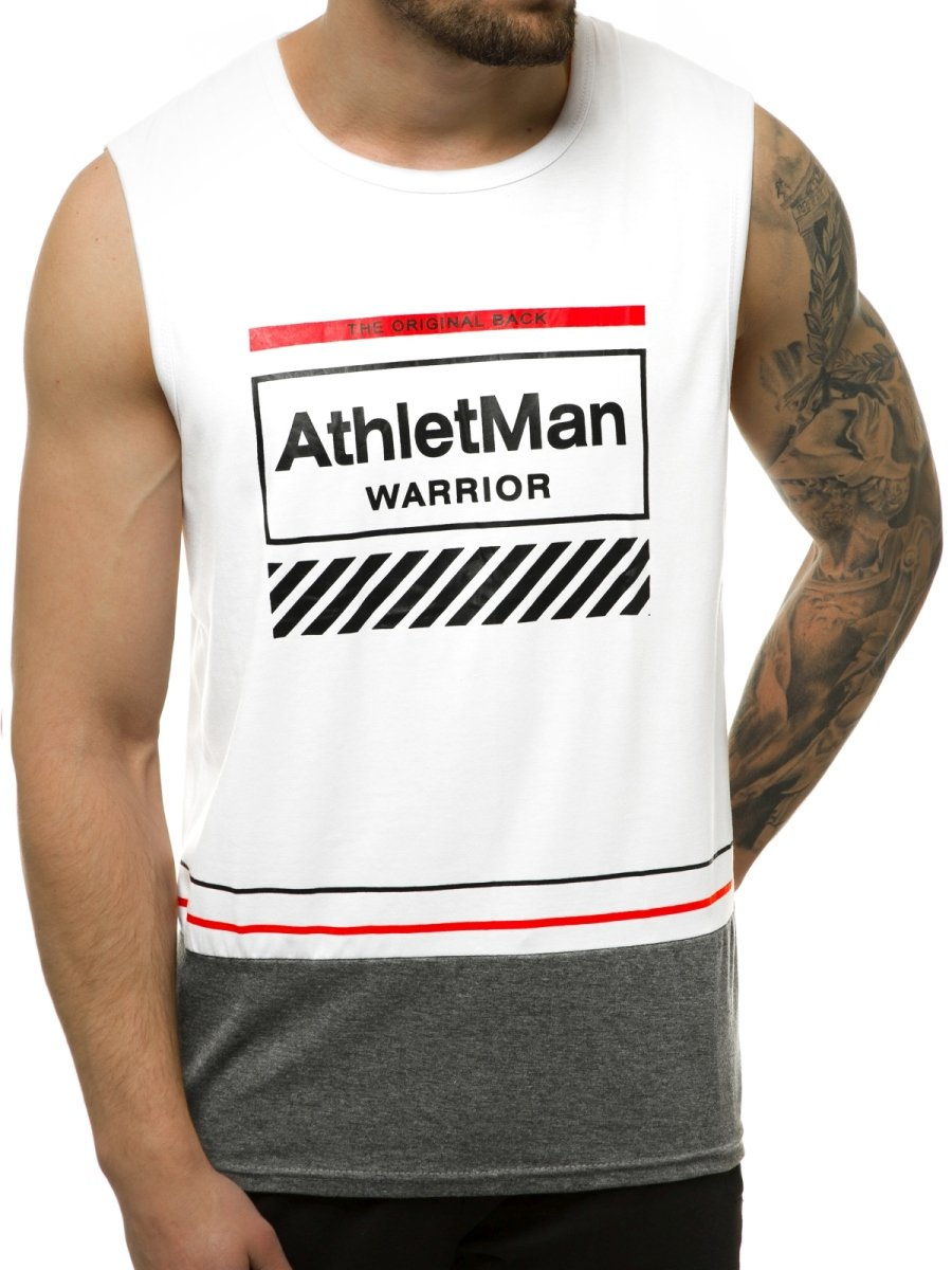 Tento typ trička bez rukávů se nazývá tanktop. Tento model má vpředu potisk a na spodní straně kontrastní spojování látek, takže vypadá velmi působivě. Tank top byl vyroben z kombinace bavlny a polyesteru. Díky tomu se hezky přizpůsobí postavě, je pohodlné na nošení, příjemné na dotek, nemačká se a neroztahuje se.
