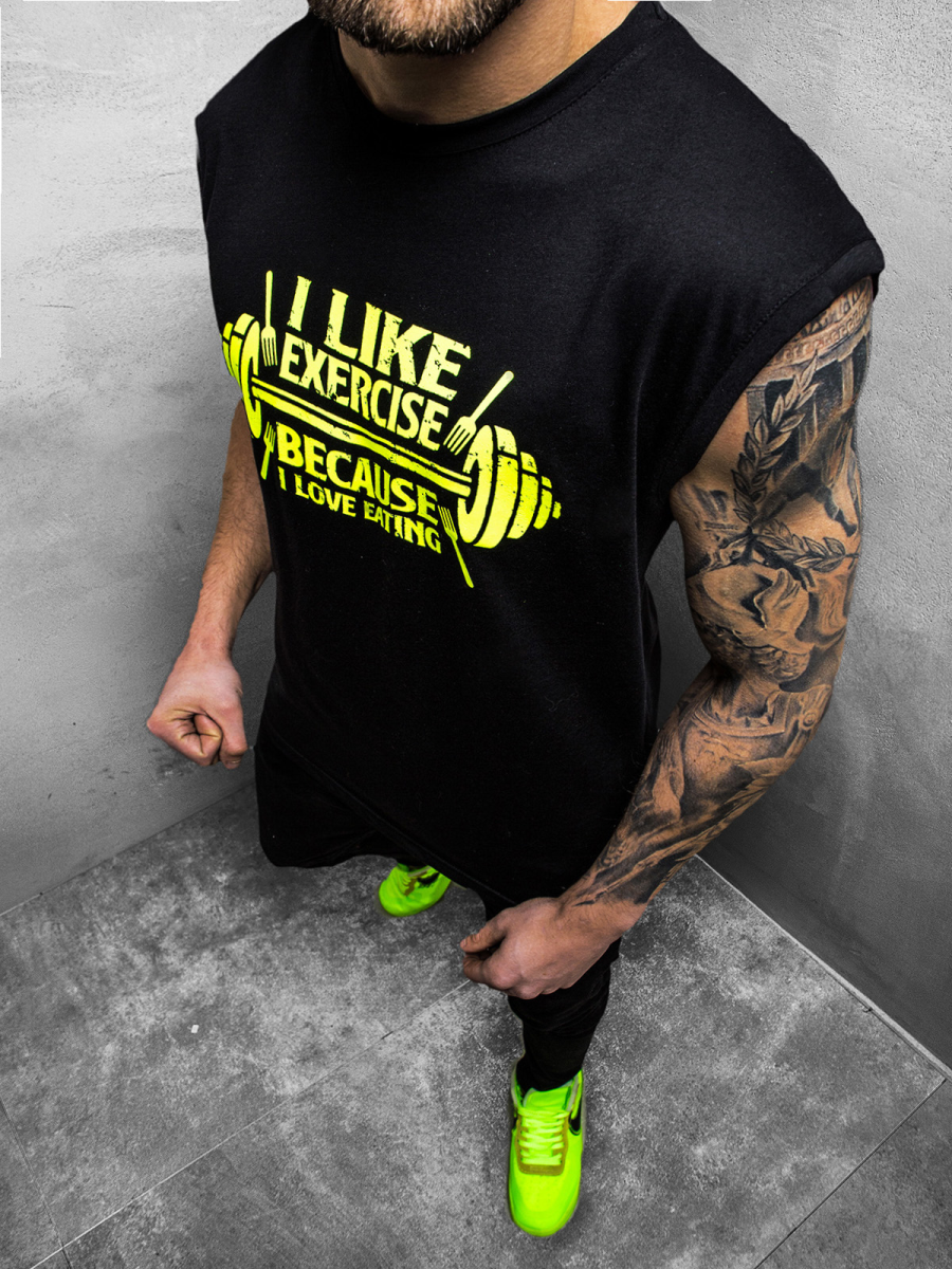 Tento typ trička bez rukávů se nazývá tank top. Uprostřed je velký, poutavý potisk. Tank top byl vyroben výhradně z bavlny. Díky tomu je velmi pohodlné na nošení, příjemné na dotek, vzdušné a odolné vůči poškození a záhybům.
