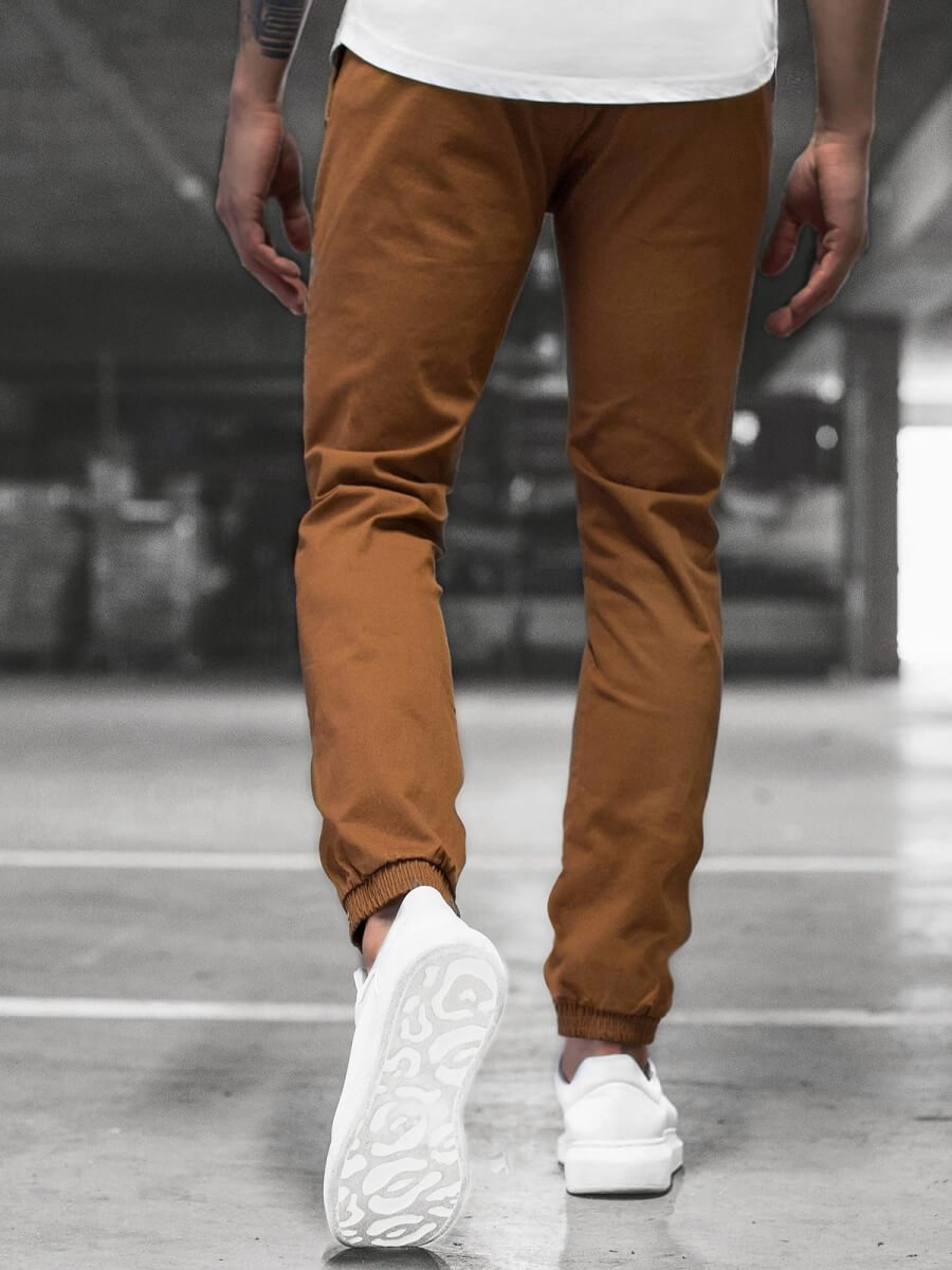 Kalhoty mají stahování v pase a na nohavicích. To usnadňuje jejich nasazení na tělo a dává célku sportovní charakteru. Chinos mají dvě kapsy po stranách a dvě vzadu na knofliky, kde můžete skrýt klíče nebo telefon. Kalhoty jsou vyrobeny z vysoce kvalitní bavlny s příměsí elastanu. Díky tomu se pěkně přizpůsobí tělu, jsou pohodlné na nošení, příjemné na dotek, v průběhu času se neroztahují a nemačkájí se.