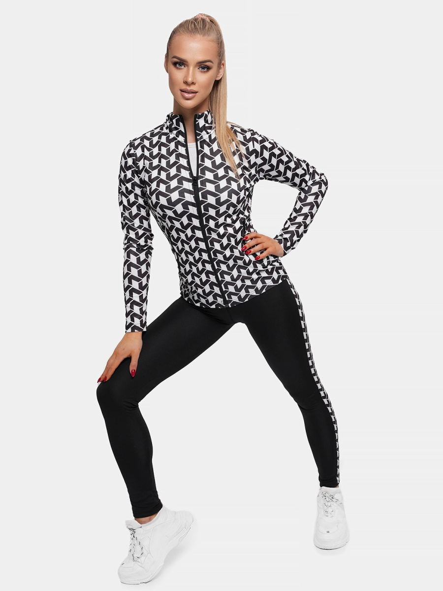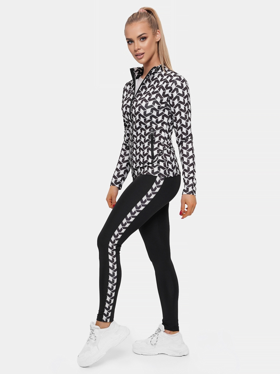 Set obsahuje legíny s pruhy v černobílém vzoru a mikinu na zip se stejným motivem jako kalhoty, s kapsami na bocích, kam schováte potřebné drobnosti, jako je klíč od šatny nebo telefon. Souprava je vyrobena z polyesteru s příměsí elastanu, díky čemuž krásně se přizpůsobí postavě a neomezuje v pohybu.