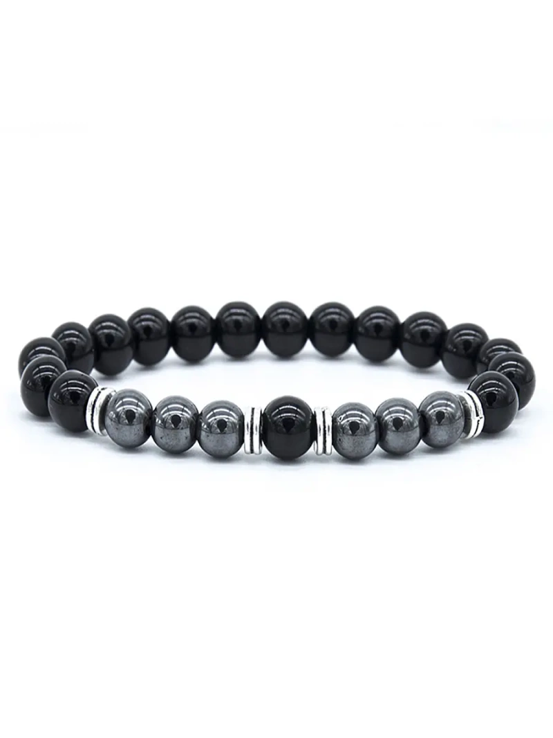 - Materiál: Černé korálky, Kovové vložky, Čtyři kovové korálky, Jeden korálek v kontrastní barvě, Natahovací guma