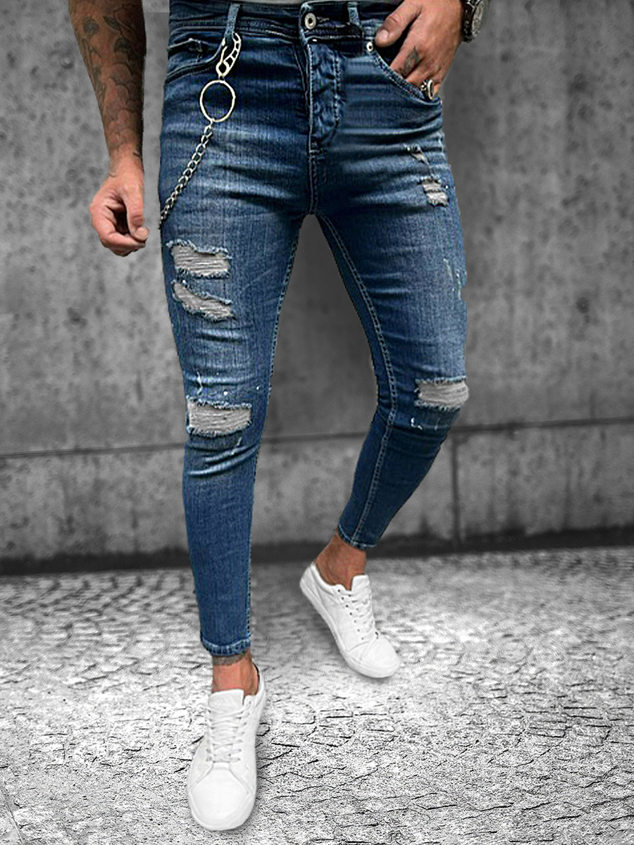 Takové kalhoty s oděrkami a odepínacím řetízkem jsou zajímavou alternativou ke klasickým hladkým modelům. Efektně oživí každou ležérní stylizaci. Džíny můžete obléct na schůzku s přáteli, na koncert nebo na párty.