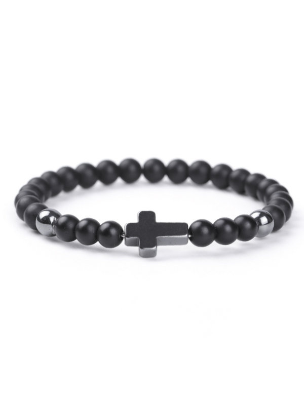 Náramek pochází z nové kolekce. Skládá se z kulatých černých korálků a kovových vložek ve tvaru kříže. Jsou umístěny na odolné elastické gumičce odolné proti roztržení, která se snadno přizpůsobí zápěstí a zaručuje vysoký komfort nošení.