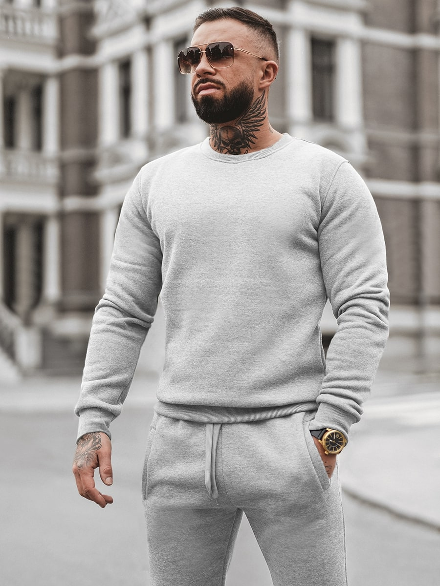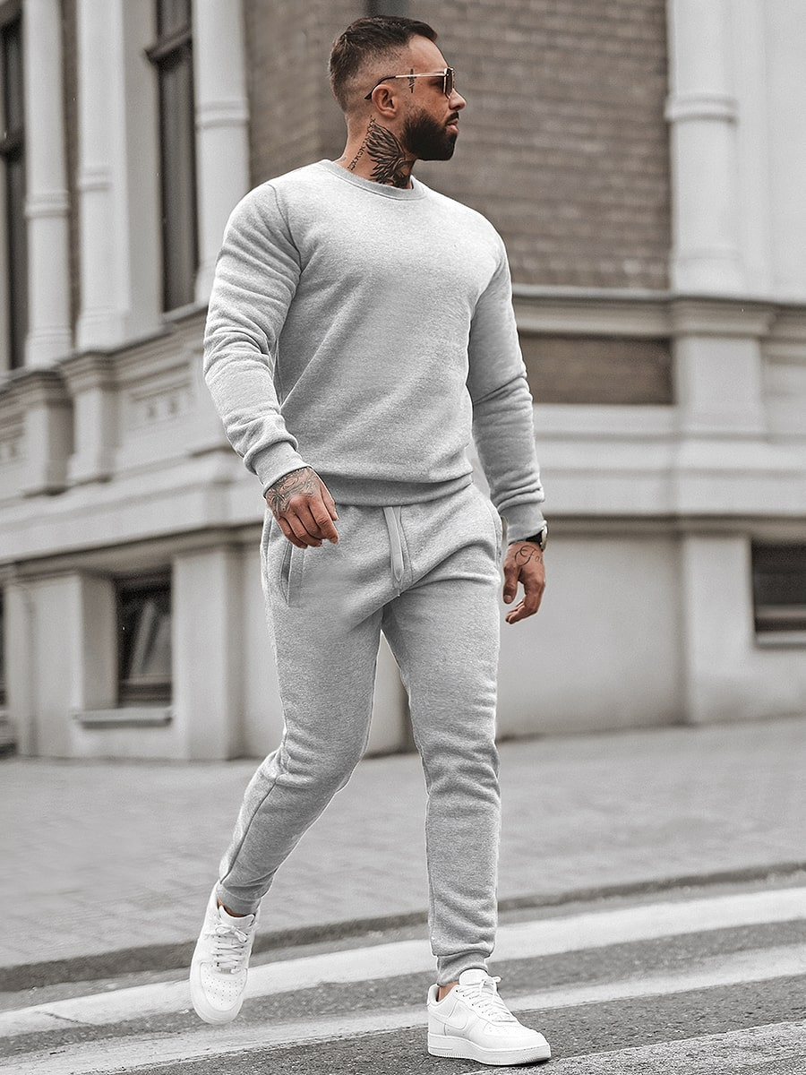 Pánská tepláková souprava se skládá ze 2 prvků. Jsou to mikina přes hlavu s dlouhým rukávem a kapucí a kalhoty s kapsami na bocích. Jsou zakončeny manžetami, které dodávají soupravě sportovní charakter. Celá je vyrobena z kombinace bavlny a polyesteru. Díky tomu je tepláková souprava pohodlná na nošení, příjemná na dotek, neomezuje v pohybu, nemačká se a rychle schne.