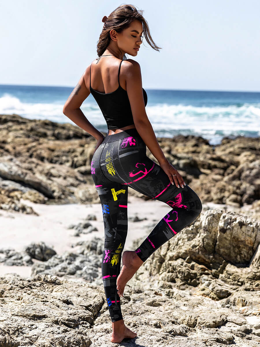 Legíny zdobí barevný vzor, díky kterému vypadají velmi efektně. Mají vysoký pas, který účinně chrání vnady postavy, jako je vystouplé bříško nebo boky. Pas se stahovací šňůrkou drží legíny na místě a zabraňuje jejich kroucení. Jsou vyrobeny z polyesteru s příměsí elastanu, díky čemuž jsou pohodlné, lehké a pěkně přiléhají k postavě.