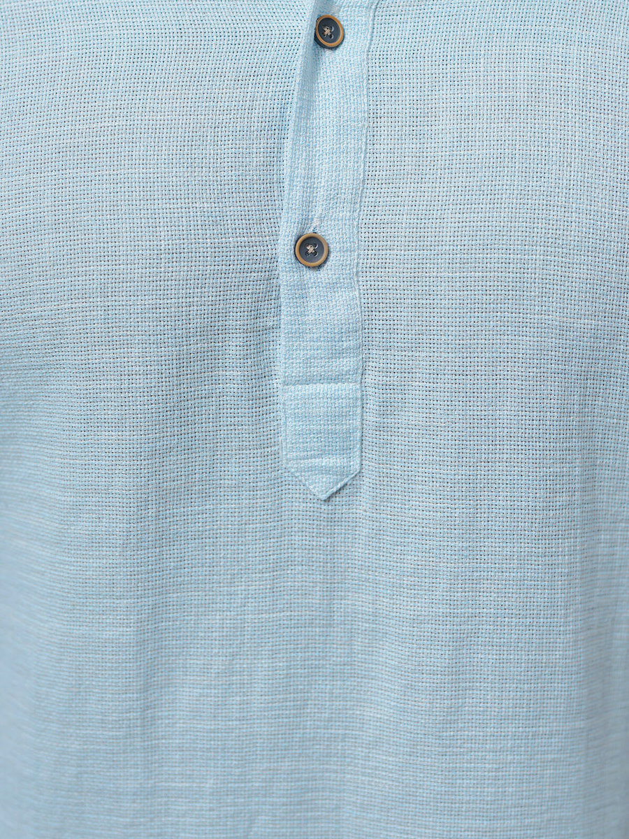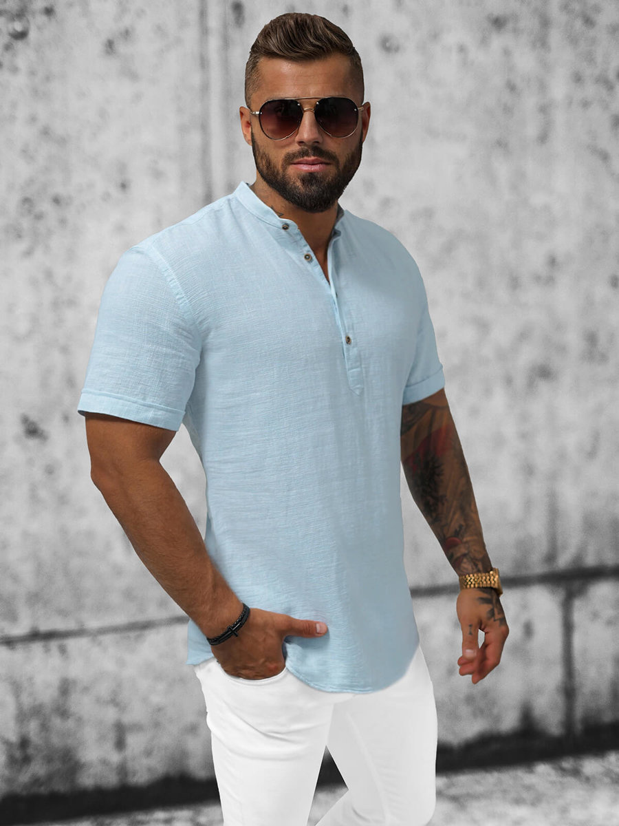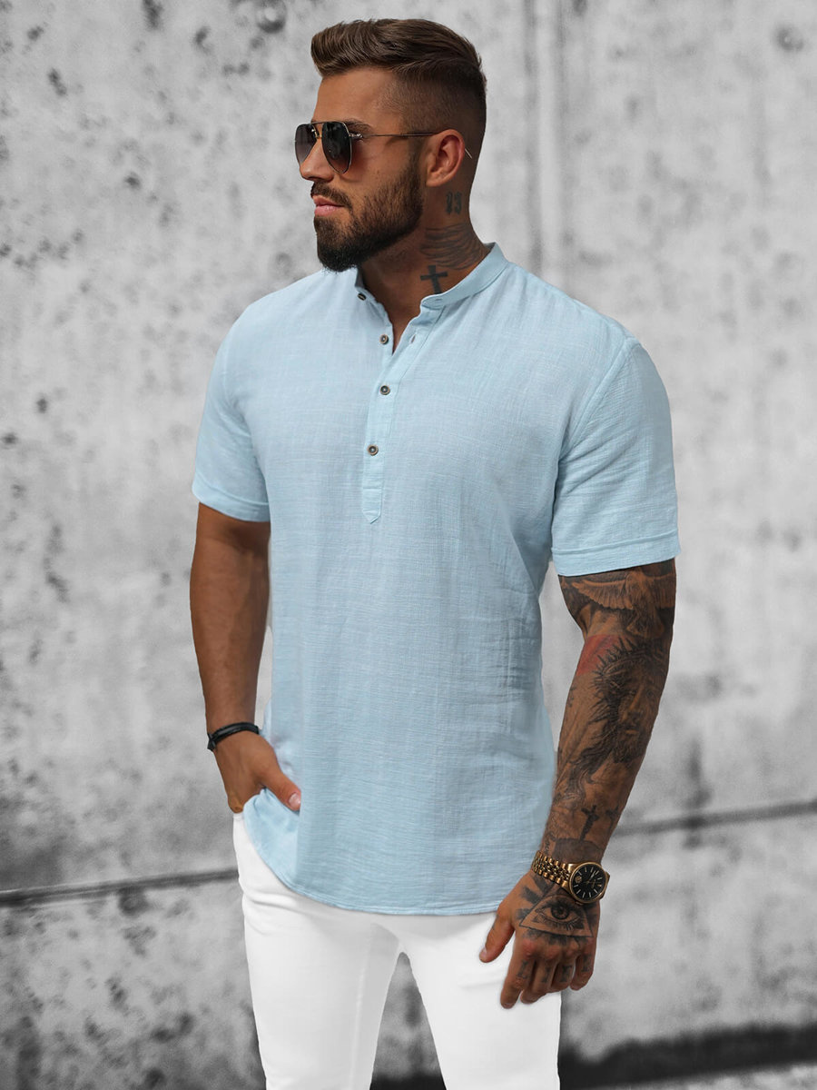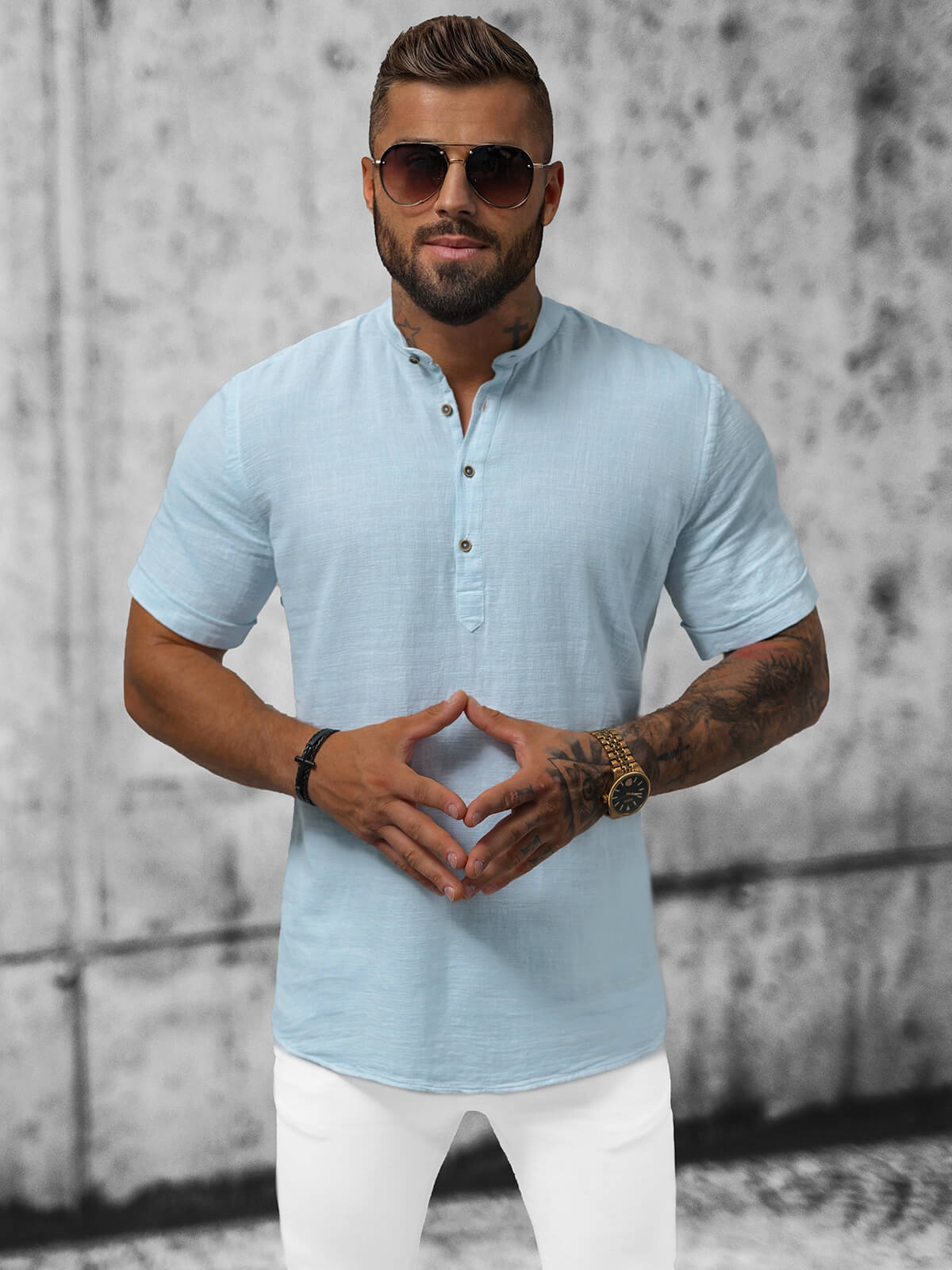 Na polovinu zapínatelná na knoflíky, tato světle modrá košile má stojací límec, který jí dodává moderní vzhled. Krátké rukávy ji činí ideální volbou pro teplé letní dny. Vyrobena z prodyšného materiálu, tato košile je ideální pro udržení chladu během horkých dnů.