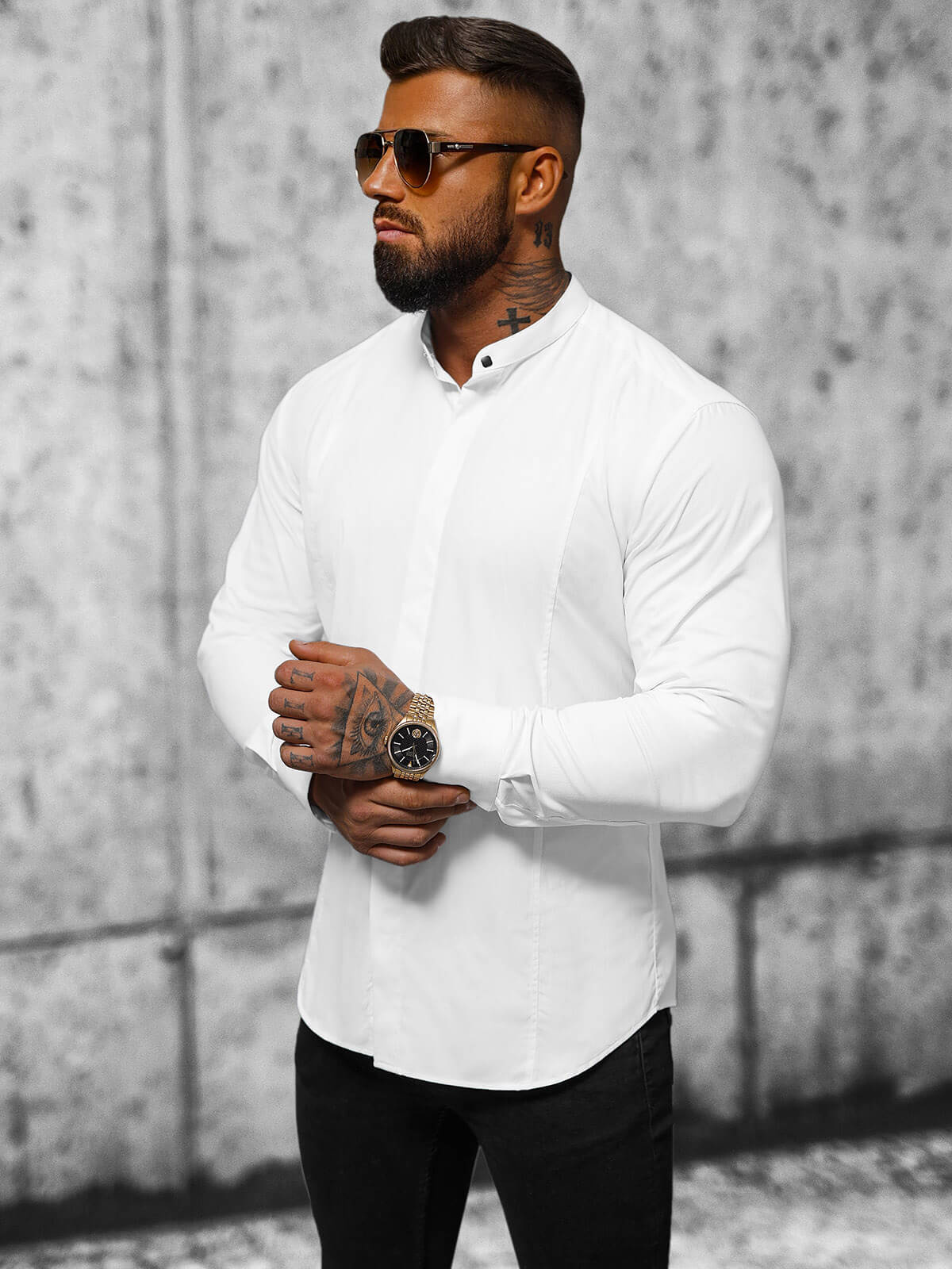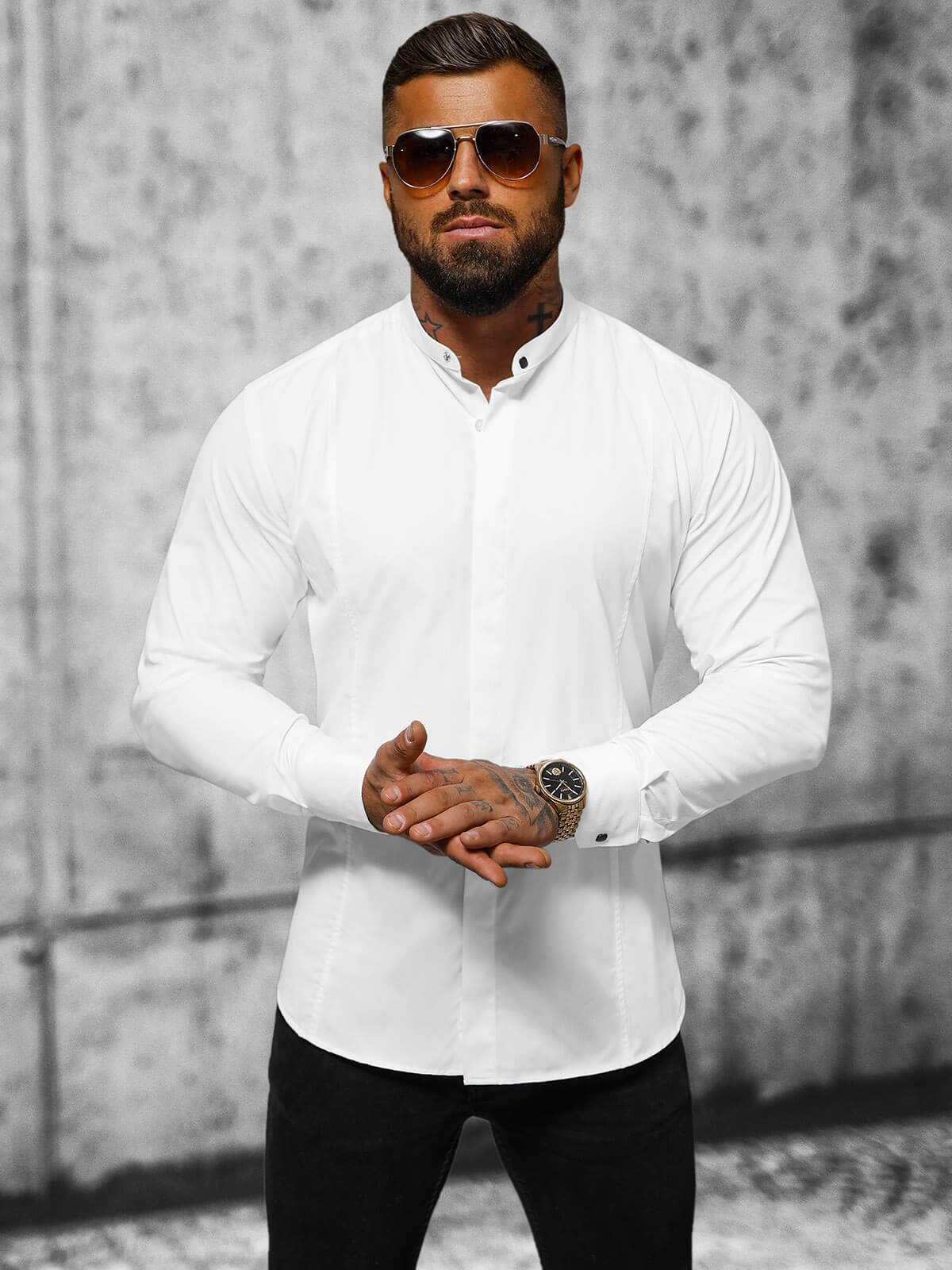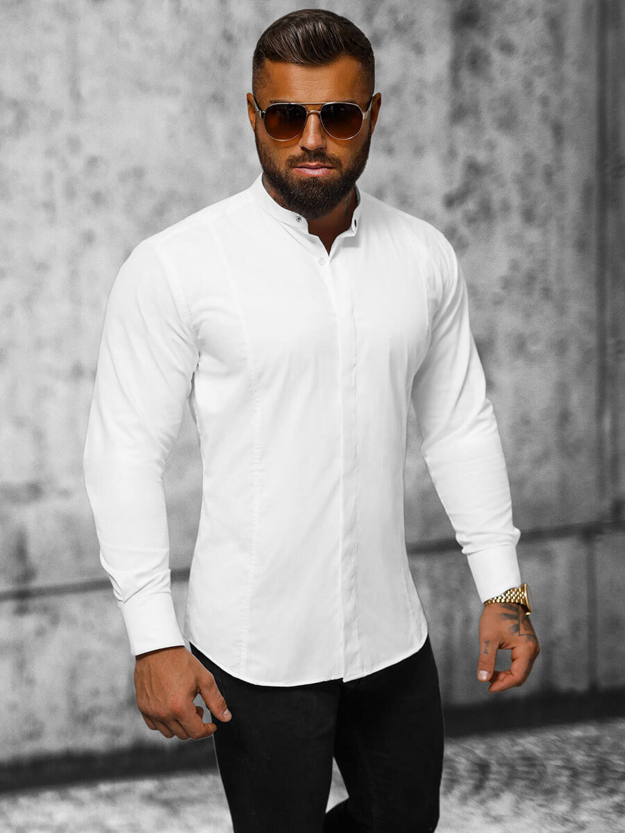 Bílá pánská košile se stojáčkem OZONEE O/V72 je univerzálním kouskem šatníku, který se hodí jak na formální schůzky, tak pro každodenní styling. Hodí se k elegantním kalhotám, ale skvěle vypadá i k džínám. Možnosti jsou nekonečné - košile na rande, obchodní schůzku nebo rodinnou oslavu. Je nezbytným kouskem šatníku každého muže.