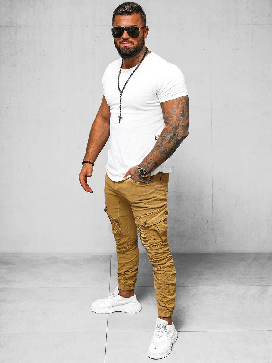 Pánské tmavě béžové chino kalhoty jogger OZONEE O/E6979H jsou ideální volbou pro každou příležitost. Jsou ideální jak na setkání s přáteli, tak na formálnější vycházky. Jejich univerzální barvu snadno zkombinujete s dalšími prvky svého šatníku a vytvoříte tak širokou škálu stylů. Skvěle se hodí k tričkům i elegantním košilím, stejně jako k různým typům obuvi.