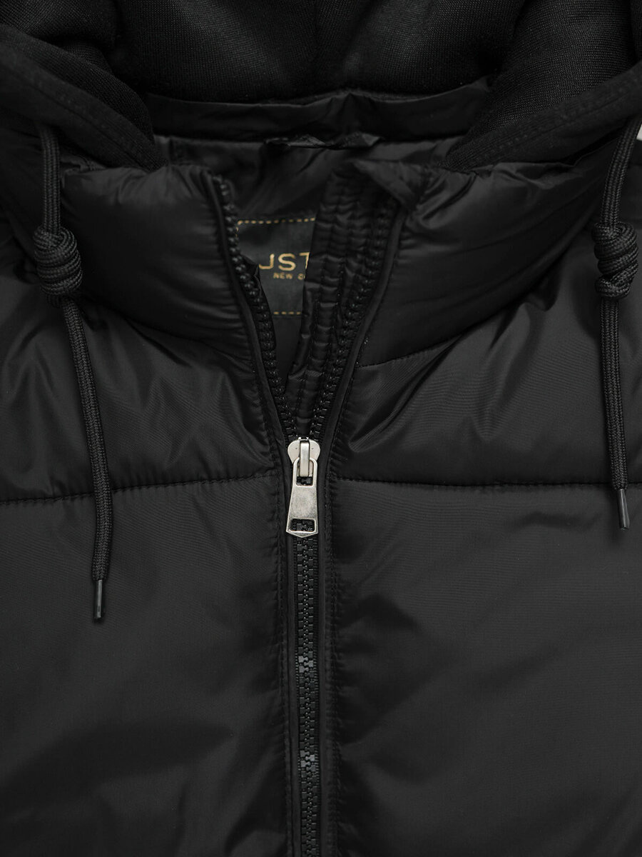Model z nejnovější kolekce, zapínání na zip, odepínací kapuce imitující mikinu, módní prošívání, kapsy na bocích, žebrované manžety