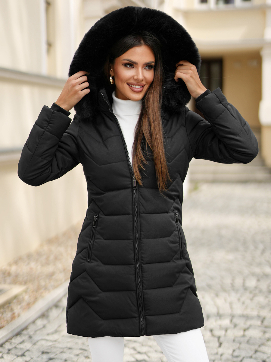 Představovaná dámská dlouhá zimní bunda s kožíškem v černé barvě je spojením elegance a funkčnosti. Je vyrobena z nejkvalitnějšího materiálów a poskytuje pohodlí a teplo i v těch nejchladnějších dnech. Módní prošívání jí dodává jedinečný charakter a odnímatelná kapuce s kožešinou je praktickým řešením při proměnlivém počasí. Bunda na zip s postranními kapsami je nezbytnou součástí zimního šatníku každé ženy.