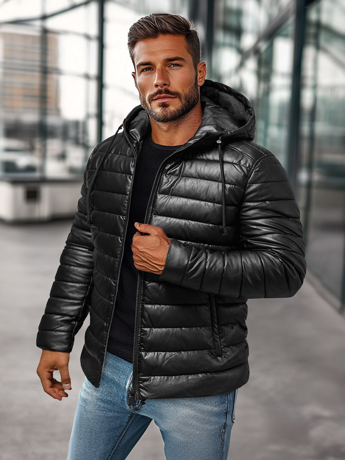 Tato černá pánská bunda z materiálu imitujícího kůži je ideální volbou pro muže, kteří ocení styl a pohodlí. Její módní prošívané lemování a kapuce jí dodávají na charakteru a odlišují ji od ostatních bund. Boční kapsy na zip a vnitřní kapsa poskytují praktický úložný prostor pro drobnosti.