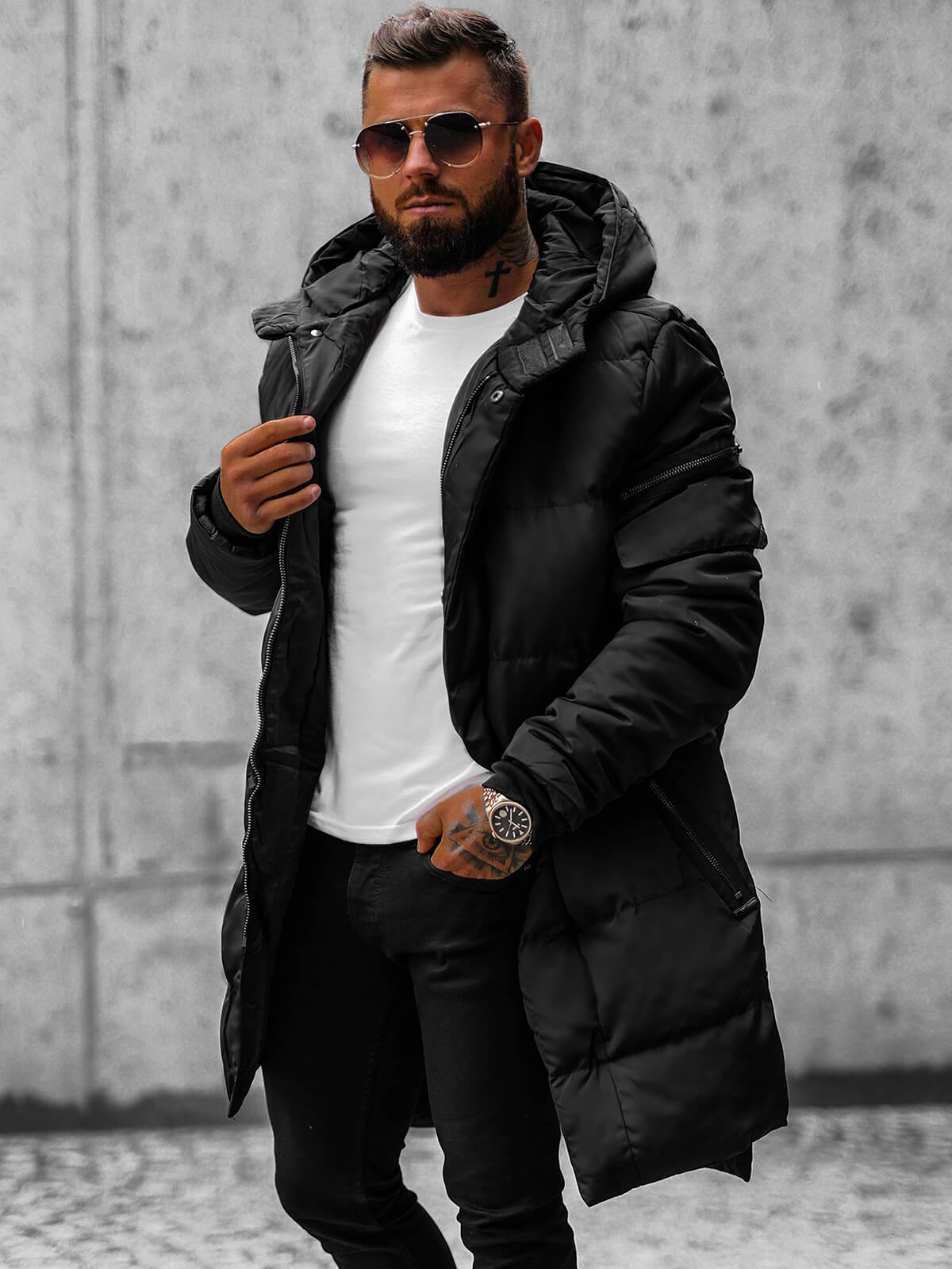 Bunda má prošívání a délku ke kolenům. Má praktickou kapuci, která účinně chrání před chladem a větrem. Jeho rukávy jsou zakončeny lemy, které chrání před chladnými poryvy. Bunda má po stranách 2 kapsy na zip, 1 vnitřní kapsu a 1 na rukávu, kam schováte peněženku, telefon nebo klíče. Je vyrobena z polyuretanu a podšívka je z polyesteru. Bunda díky tomu krásně sedí na postavě, nemačká se a rychle schne.