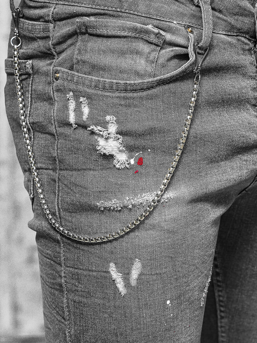 Tyto jedinečné pánské džíny slim fit střihu jsou kombinací stylu a pohodlí. Přiléhavě padnou, zdůrazňují siluetu a zároveň umožňují volnost pohybu. Módní odírání jim dodává charakter, zatímco ozdobný odnímatelný řetízek je poutavým detailem, který podtrhuje individuální styl. Kapsy na přední a zadní straně jsou nejen praktické, ale poskytují také zajímavý dekorativní prvek.