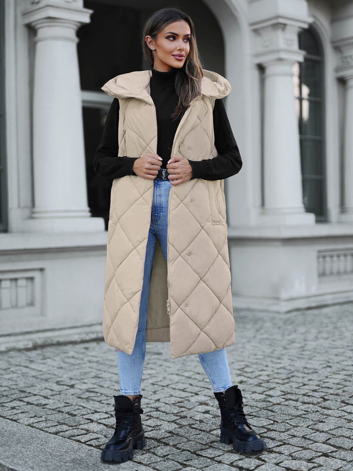 Tato dlouhá dámská vesta je ideální pro chladnější dny. Můžete ji nosit na procházky, při nákupech nebo při setkání s přáteli. Skvěle se hodí k džínům, legínám, ale i k šatům a sukním. Díky svému prošívanému vzoru dodá vašemu stylingu originalitu a eleganci.