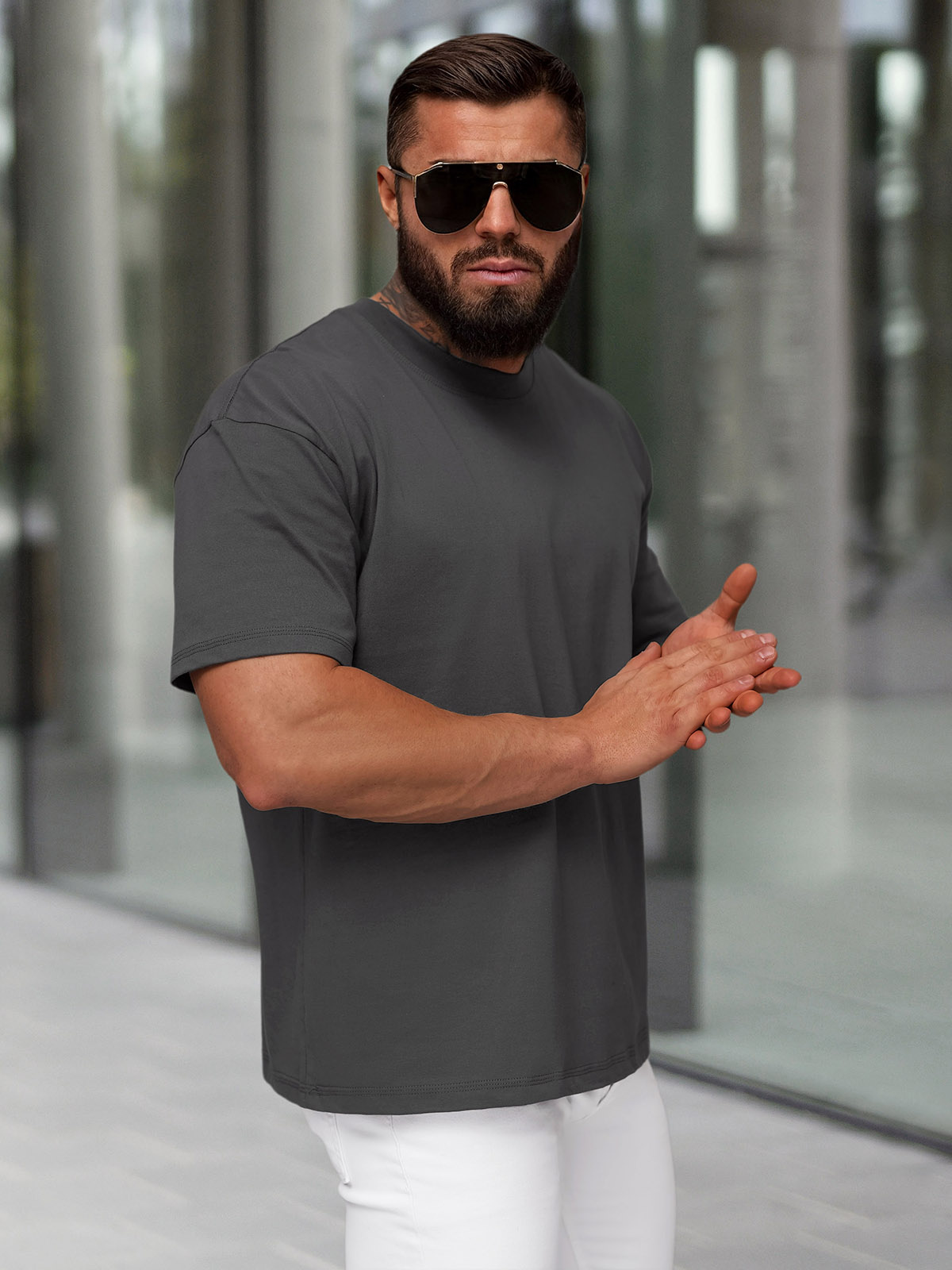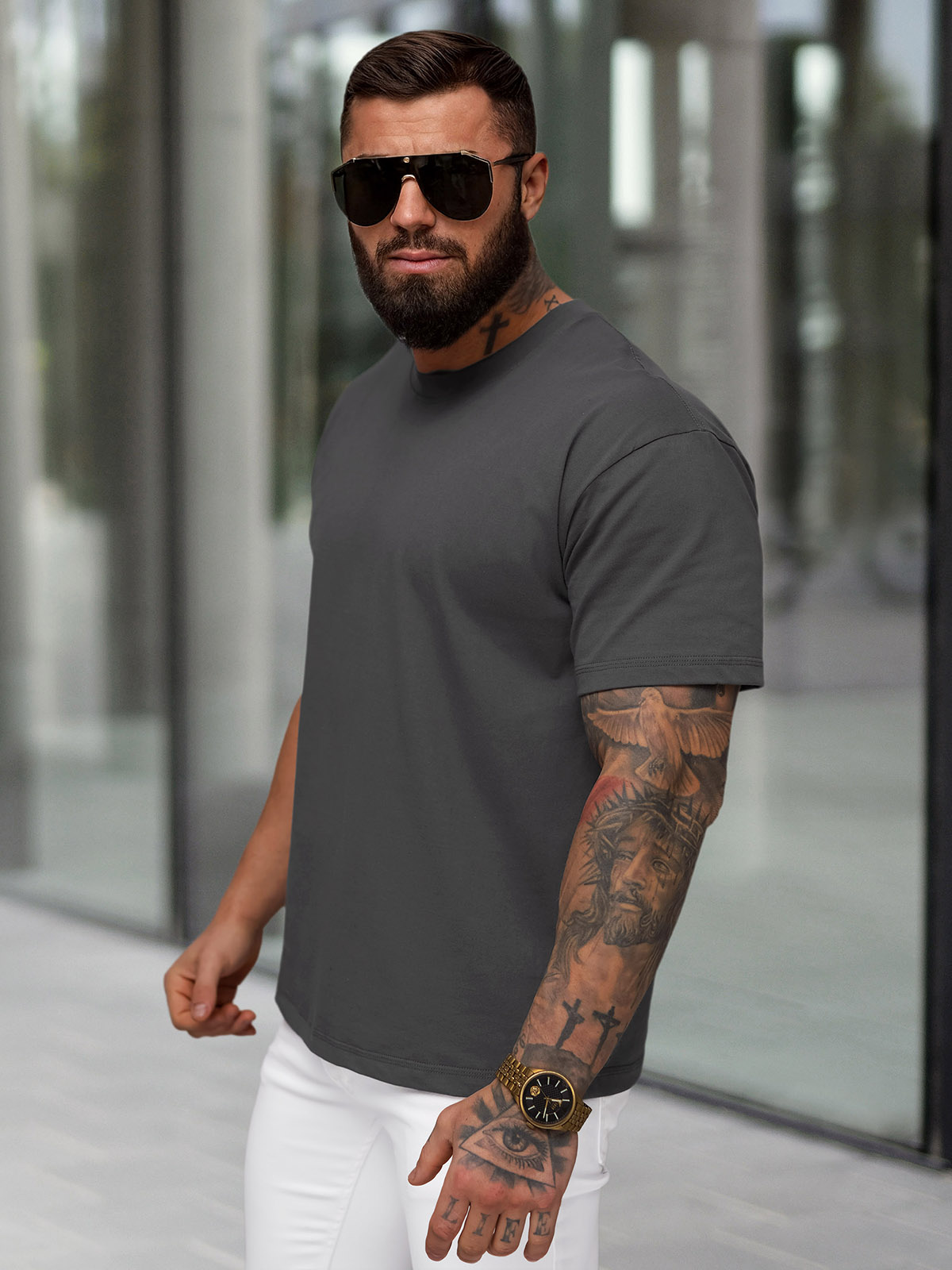 - Model (182 cm, 87 kg) a má na sobě velikost L.