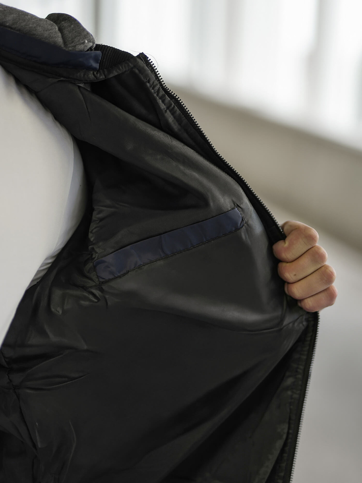 Bunda z nejnovější kolekce. Spodní část a rukávy jsou zakončeny lemy, které dodávají sportovní charakter. Bunda s odepínací kapuci imitující mikinu, která se skvěle hodí do chladných, větrných, deštivých dnů. Dvě kapsy na bocích a jednu na rukávu, kam schováte drobnosti jako klíče, telefon nebo peněženku. Bunda je potažena prošíváním, díky čemuž vypadá velmi efektně. Vyrobená z polyesteru, díky kterému je odolný vůči nečistotám a rychle schne.