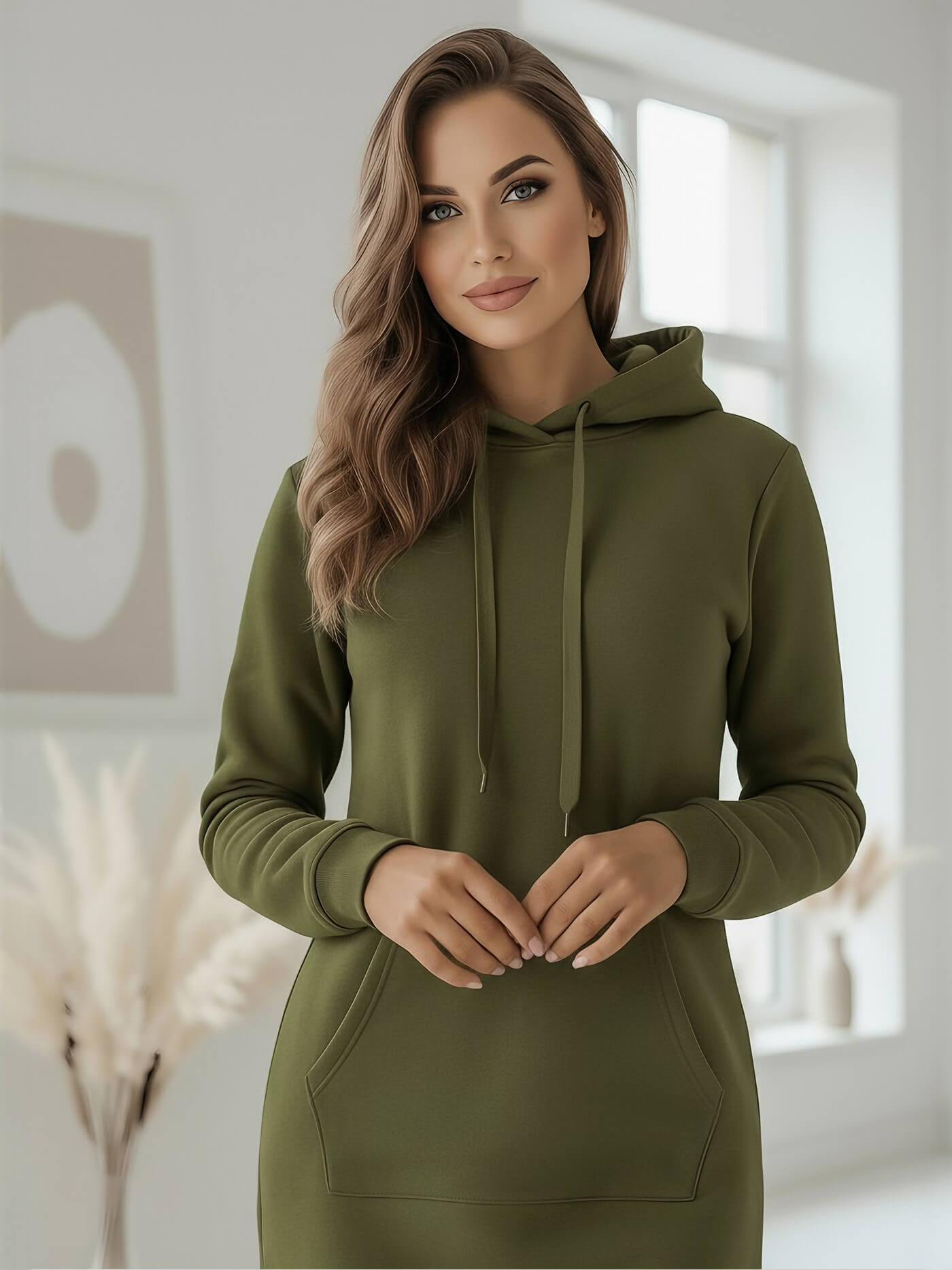 Mikina pochází z nejnovější kolekce. Nasazuje se přes hlavu a má delší střih do poloviny stehna. Mikina má praktickou kapuci, která účinně chrání před chladem a větrem. Její spodní část a rukávy jsou zakončeny stahováním, které jí dodávají sportovní charakter. Mikina má klokaní kapsu. Byla vyrobena z kombinace bavlny a polyesteru. Díky tomu krásně se přízpůsobi postavě, je příjemná na nošení, je příjemná na dotek a je odolná proti poškození a pomačkání.