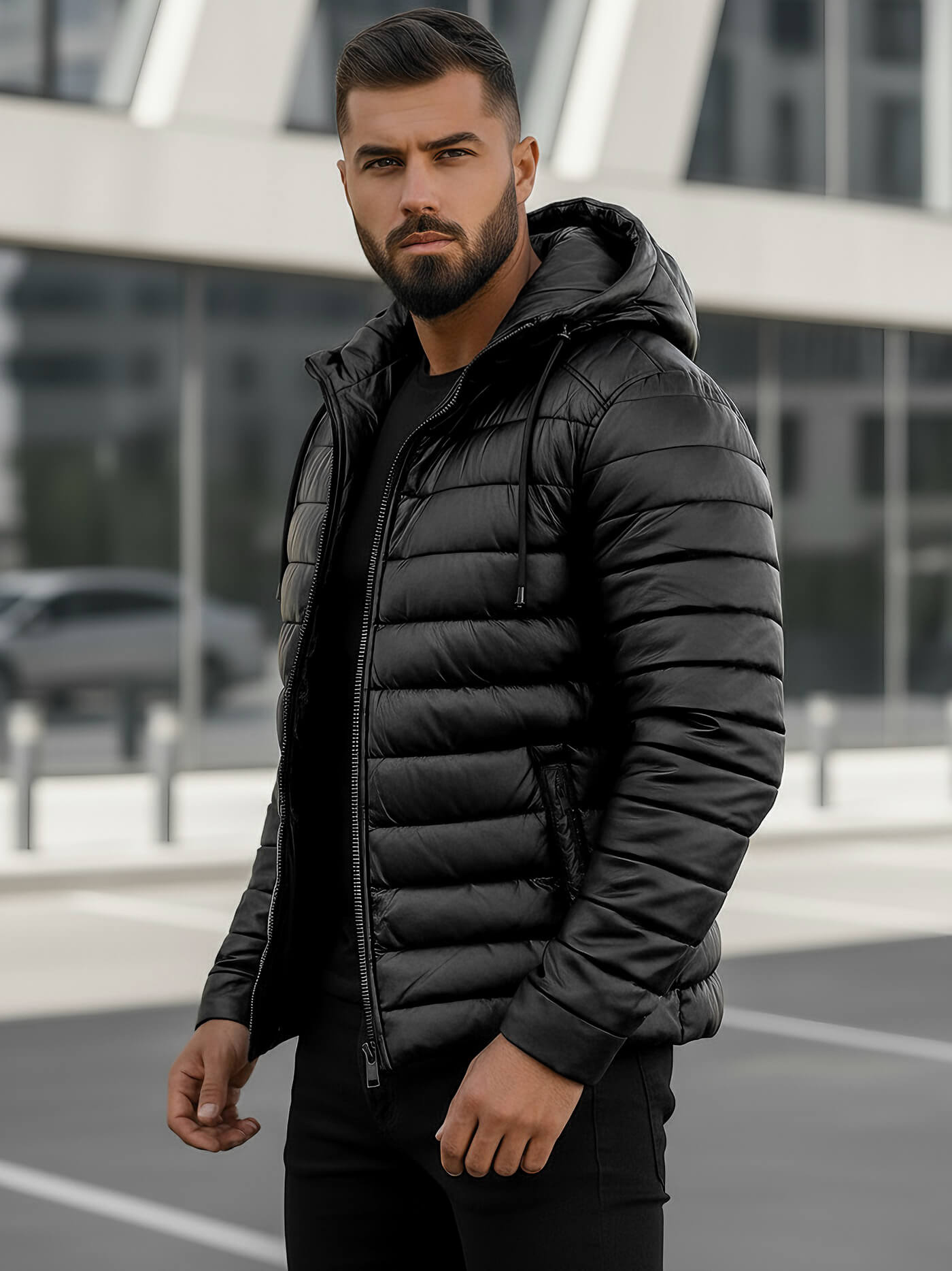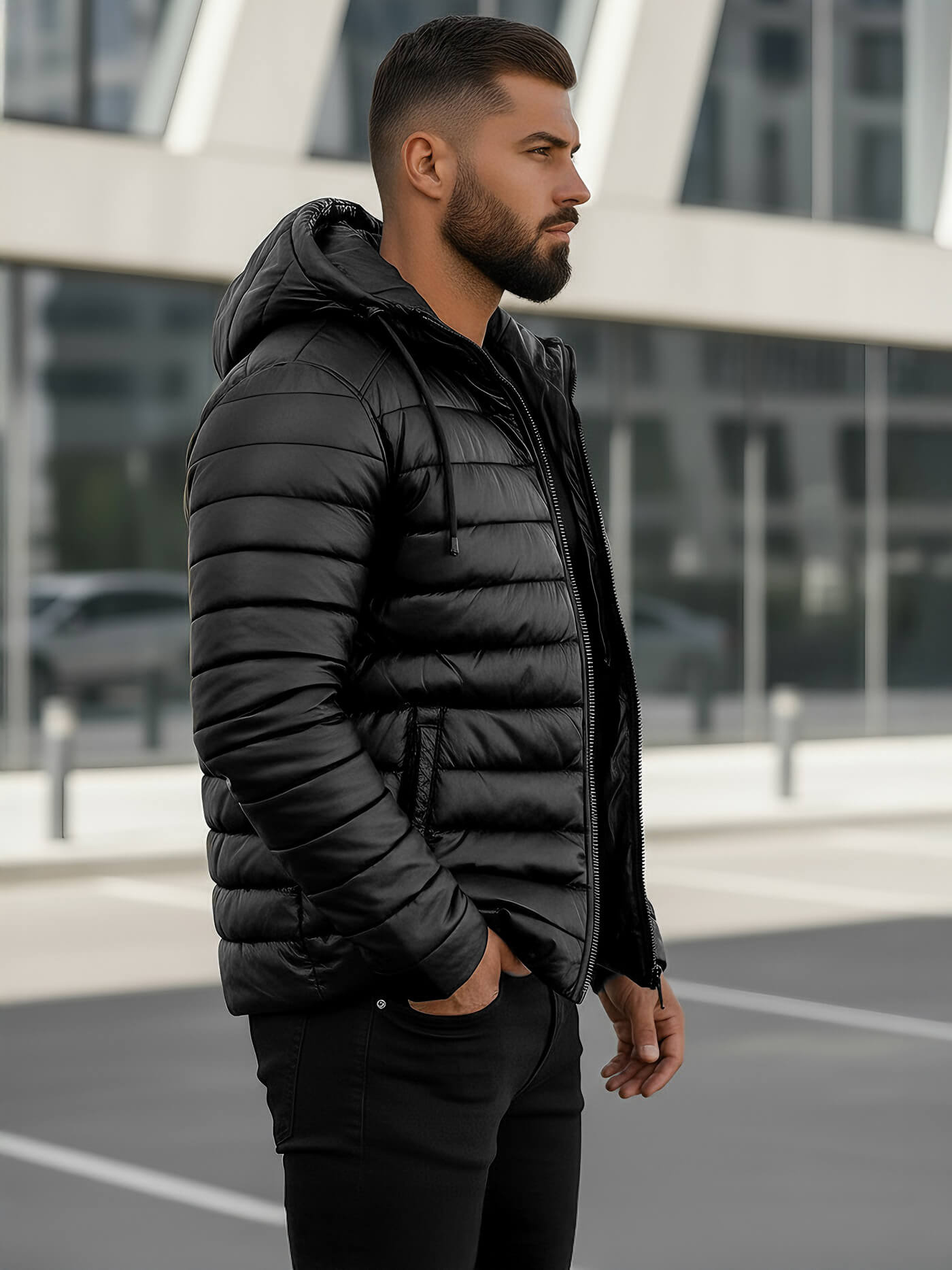Tato černá pánská bunda z materiálu imitujícího kůži je ideální volbou pro muže, kteří ocení styl a pohodlí. Její módní prošívané lemování a kapuce jí dodávají na charakteru a odlišují ji od ostatních bund. Boční kapsy na zip a vnitřní kapsa poskytují praktický úložný prostor pro drobnosti.
